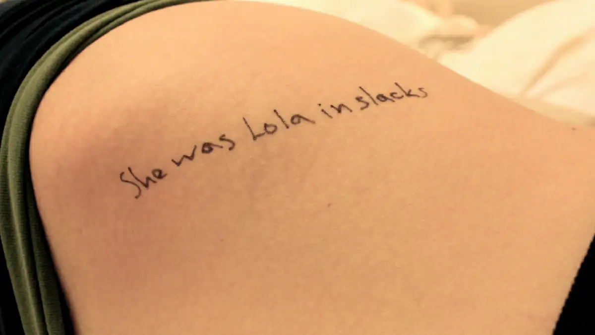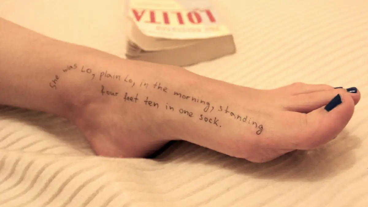 Ein Teil davon zeigen die Körperteile einer Frau. Auf ihrem Fuß, ihrer Brust und auf ihren Rücken wurden mit der Hand mehrere Nachrichten geschrieben. „Lo-li-ta: Die Zungenspitze unternimmt eine Reise von drei Schritten den Gaumen herunter, um beim dritten an die Zähne zu stoßen. Sie war Lola in Hosen“, steht unter anderem auf ihrem Körper. Auch die Notiz auf ihrem Fuß wirft zuerst einmal Fragen auf: „Sie war Lo, einfach Lo, am Morgen, wenn sie vier Fuß zehn groß in einem Söckchen dastand.“ Im Hintergrund ist ein Buch zu sehen, das den Titel „Lolita“ trägt. Aus diesem Buch wurde zitiert.