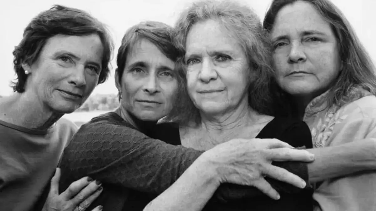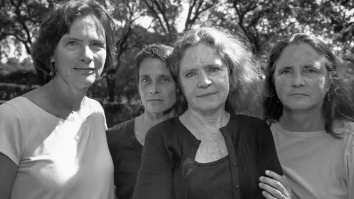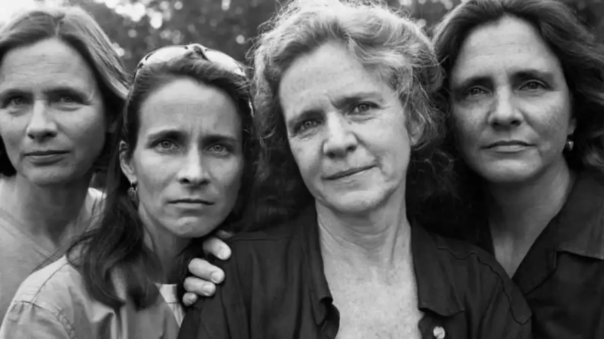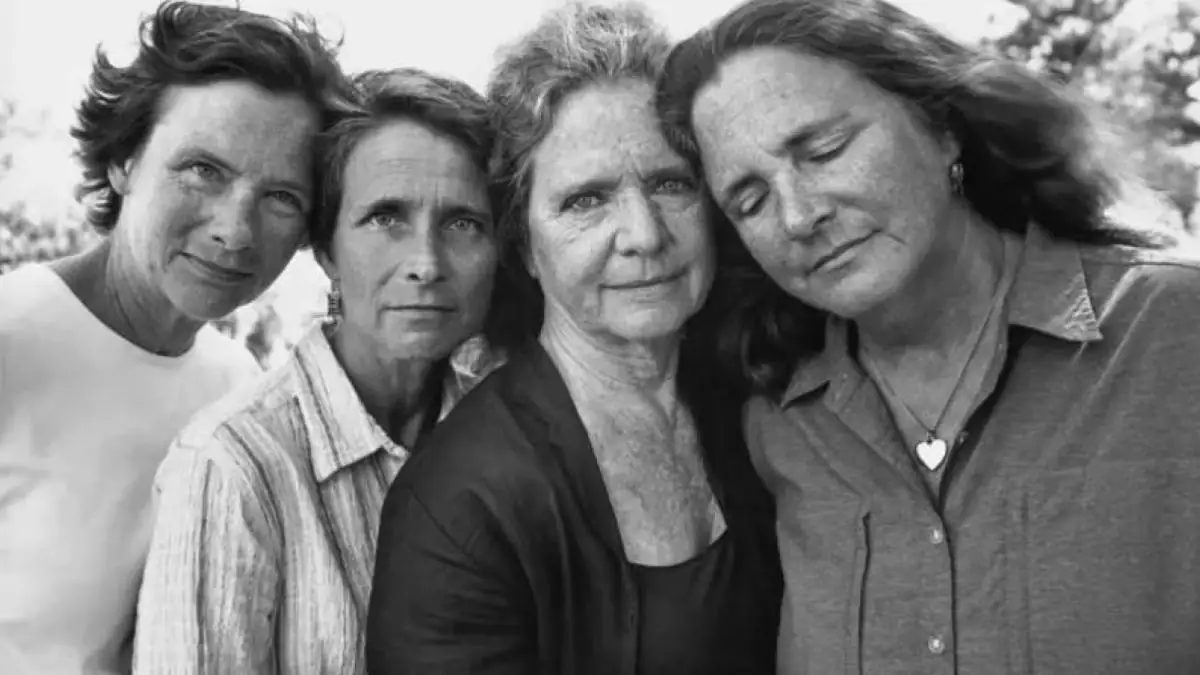 Im Foto aus dem Jahr 1998 rückt Nixon bewusst Bebe ins Zentrum der Aufnahme. Die drei Schwestern stehen um sie herum, um sie zu unterstützen und hervorzuheben. Diese Komposition betont die besondere Rolle, die Bebe in ihrem Leben spielt, und zeigt die Stärke ihres Schwesterbundes.
