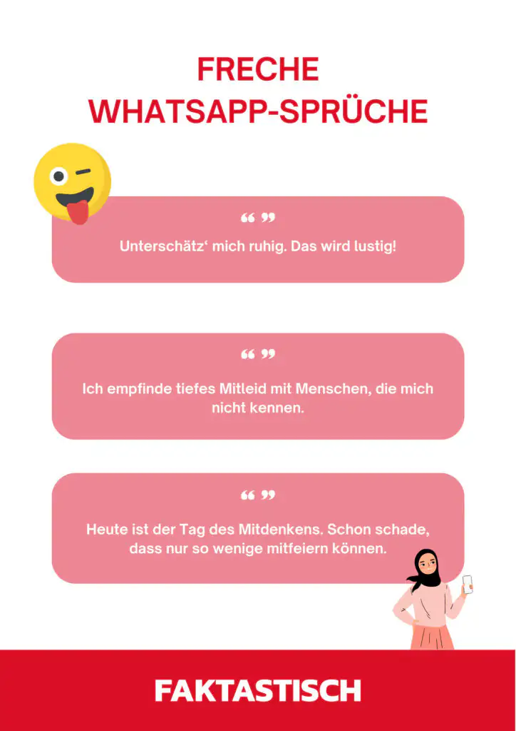 Es ist wichtig, die Grenze zwischen Frechheit und Respektlosigkeit nicht zu überschreiten. Wenn man es schafft, die richtige Balance zu finden, können freche oder nachdenkliche WhatsApp-Status-Sprüche eine gute Möglichkeit sein, um die Persönlichkeit und Cleverness zum Ausdruck zu bringen. Viele Texte lassen sich auch prima für Instagram oder Facebook nutzen.