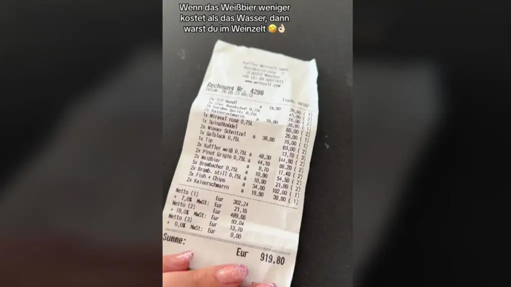 „Von so viel Geld fahre ich in den Urlaub“, oder „das ist meine gesamte Monatsmiete“, heißt es unter dem Clip, der mittlerweile schon über 1.6 Millionen Mal angeklickt wurde. Tatsächlich hat die Userin Jessie ganze 919,80 Euro ausgegeben. „Wenn das Weißbier weniger kostet als das Wasser, dann warst du im Weinzelt“, schreibt sie zu ihrem Beleg. Darauf ist zu erkennen, dass gerade einmal eine Portion „Fish and Chips“ 34,00 Euro gekostet hat.