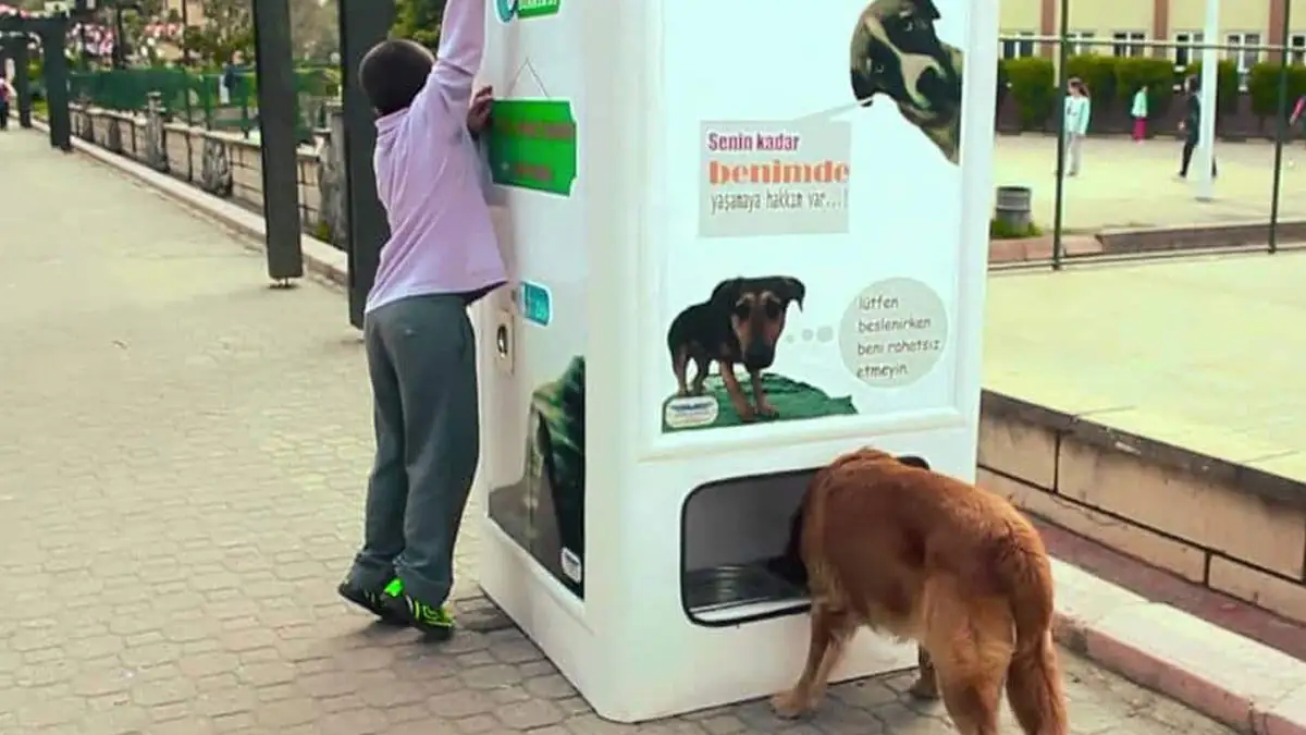 Ist das nicht eine geniale Idee? Die Firma Pugedon hat Automaten entwickelt, in die Menschen Plastikflaschen einwerfen können. Dafür spenden die Automaten dann Futter für streunende Hunde und Katzen.