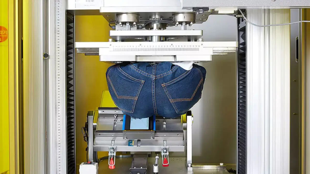 Okay, genau genommen ist es nicht der Roboter, der die Form eines menschlichen Hinterns angenommen hat, sondern die Vorrichtung, die man daran angebracht hat. Damit der Test auch den echten Bedingungen entspricht, hat die Po-Form von Samsung sogar eine Jeans an.