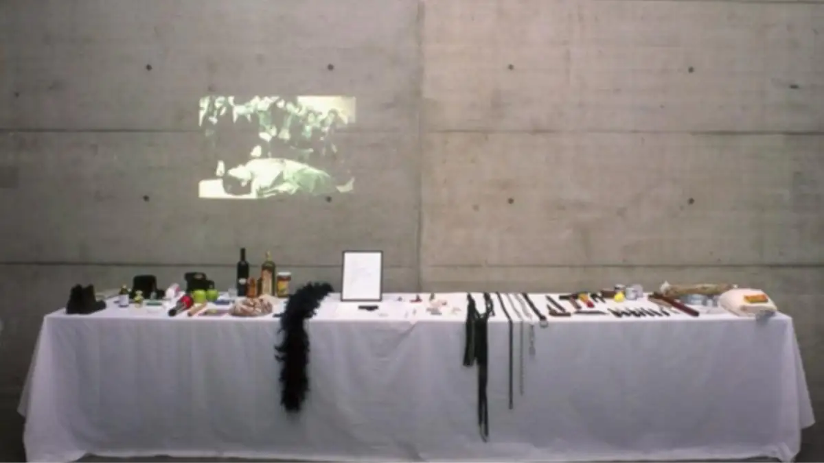 Am Anfang der Performance stellte Marina Abramović 72 verschiedene Objekte auf einen Tisch. Ziemlich komisch, oeder? Diese reichten von ungefährlichen Dingen wie Äpfeln und Blumen bis hin zu riskanten Gegenständen wie Messern und sogar bis zu einer geladenen Pistole.