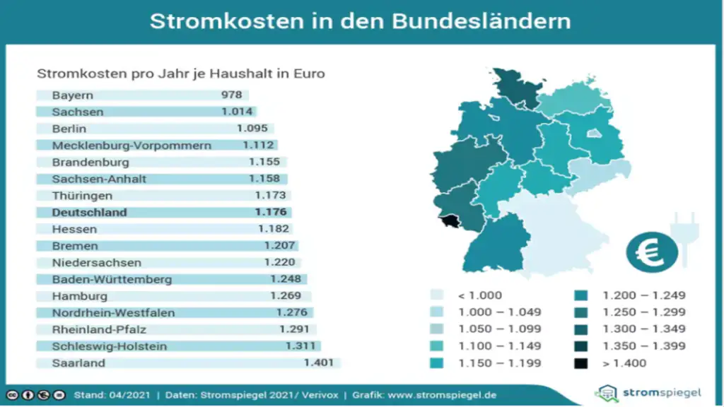 Die Kosten selbst stehen auch im direkten Zusammenhang mit dem Stromverbrauch. So liegt der Pro-Kopf-Verbrauch im Saarland bei1459kwH. In Bayern mit 1112 kwH ist der Wert deutlich geringer. Auch Sachsen kommt mit 1.014 Euro günstig weg, während Schleswig-Holstein mit 1.311 Euro auf Platz zwei liegt.