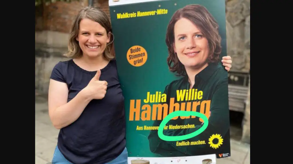 Auf dem Plakat ist Julia Willie Hamburg zu sehen, die bei der Landtagswahl für den Kreis Niedersachsen kandidiert. Sie strahlt in die Kamera, während neben ihr die Aufforderung „Beide Stimmen grün“ zu lesen ist. Vorerst wirkt das Plakat ganz normal, bis man weiter nach unten schaut.