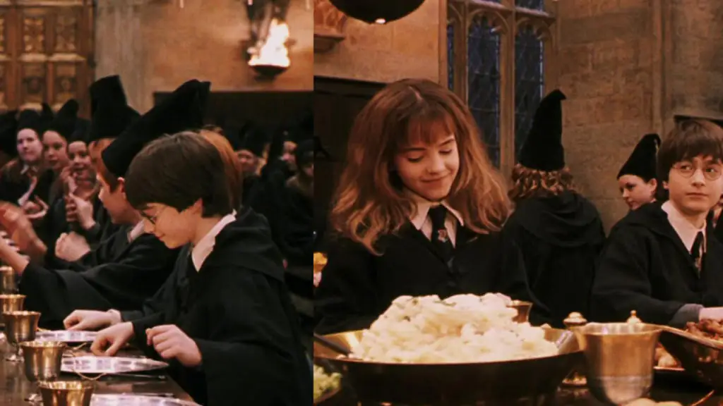 In „Harry Potter und der Stein der Weisen“ werden den Schülern Sitzplätze zugeteilt. Nachdem Harry zu „Gryffindor“ gekommen ist, setzen sich alle zum Festmal hin. In der nächsten Szene sitzt Harry plötzlich auf der anderen Seite des Tisches.