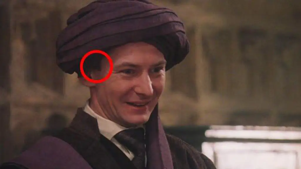 Beim eigentlich glatzköpfigen Quirinus Quirrell, der als turbantragender nervöser Professor der dunklen Künste bekannt ist, gucken unter dem Turban seitlich Haare hervor, die so gar nicht zu seiner Glatze passe wollen.