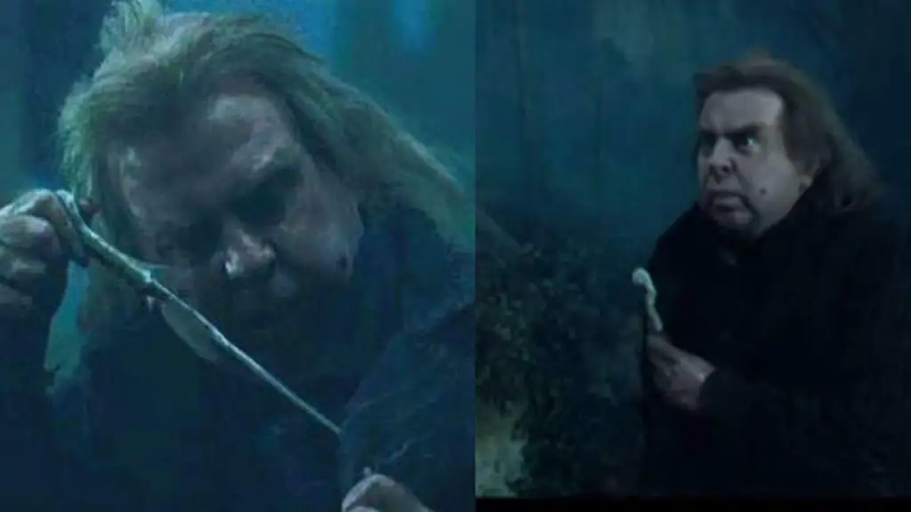 Der Zauberstab Voldemorts wird von Peter Pettigrew in der linken Seite seines Mantels versteckt aber aus der rechten Innentasche wieder hervorgeholt – Magie im Mantel?