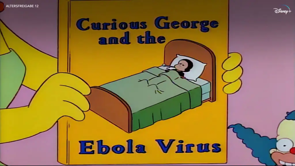 Marge schlägt Bart darin vor, doch mal das Buch: “Curious George and the Ebola Virus“ zu lesen. Damals war das Virus zwar bekannt, jedoch kein nennenswerter Ausbruch.