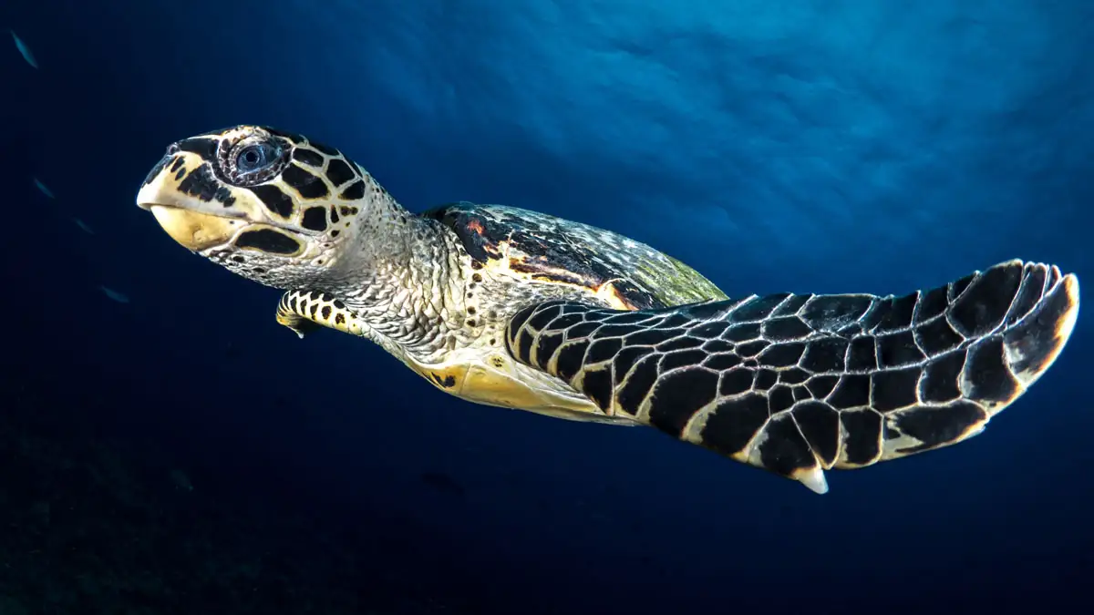 Echte Karettschildkröten können bis zu 110 cm groß werden und bis zu 85 kg wiegen. Es wird gesagt, dass sie stark mit Korallenriffen assoziiert werden und wie so oft unter den Folgen menschlichen Handelns leiden, da sie sich in den Netzen verfangen können, die Fischer ins Meer werfen.